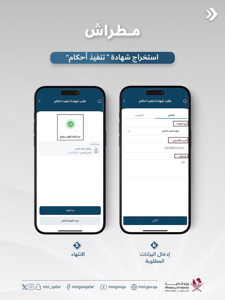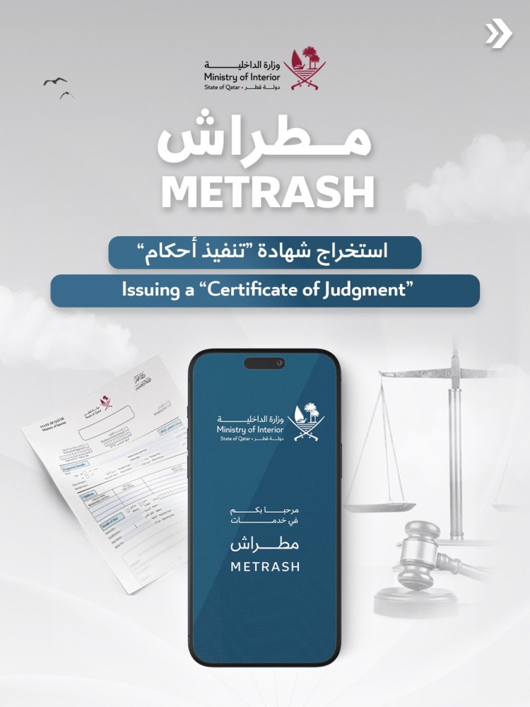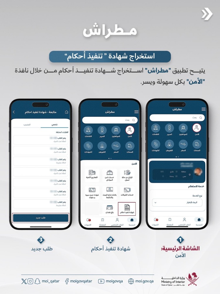 نوّهت وزارة الداخلية بالخدمات التي توفرها نافذة الأمن بتطبيق مطراش، ومنها خدمة استخراج شهادة "تنفيذ أحكام"، بسهولة ويسر.