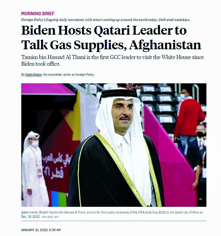 بدورها أوردت مجلة فورين بوليسي أن أجندة اللقاء بين صاحب السمو والرئيس بايدن مزدحمة بعدد من القضايا الدولية المشتركة. ومن المتوقع أن يعتمد بايدن على دولة قطر لدعمه في مواجهة قوة صادرات الغاز الروسي في أوروبا من خلال إرسال بعض مخزوناته إلى القارة.