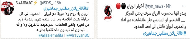 على ما يبدو أن علاقة الفرنسي لوران بلان مدرب الريان مع الجماهير قد انتهت بعد خسارة الفريق من العربي بهدفين مقابل هدف في إطار الجولة الثامنة من دوري نجوم QNB، وتوقف رصيد الرهيب عند تسع نقاط، وعقب اللقاء ظهر غضب جماهيري عارم على موقع التواصل الاجتماعي تويتر وأطلقوا "هشتاج" تحت عنوان "إقالة بلان مطلب جماهيري"، وتعددت الآراء حول سبب هذا الطلب.. فمنهم من أكد أن الفريق يبتعد خطوة بخطوة عن المربع هذا الموسم، ومنهم من اكد أن الرهيب لم يقدم المستويات المعهودة على الرغم من امتلاكه اسماء جيدة، ومنهم من يقول أن المدرب لا يعرف وضع التشكيلة المناسبة وهذا يظهر واضحا من خلال الأداء العشوائي داخل الملعب وتواجد عناصر يلعبون في غير مراكزهم، ولذلك بالفعل قد يكون لوران يقضي أيامه الأخيرة مع الريان على الرغم ان عقده مستمر لنهاية الموسم، ولكن في ظل هذا الأداء الباهت والنتائج المخيبة للآمال قد يكون لمجلس ادارة النادي برئاسة سعادة الشيخ علي بن سعود آل ثاني قرارا سريعًا بتوجيه الشكر للمدرب، ومن المتوقع ان تكشف الايام القادمة عن احداث جديدة، سواء باستمراره وإعطائه فرصة أخرى او توجيه الشكر له والبحث عن مدرب آخر يقود الريان.