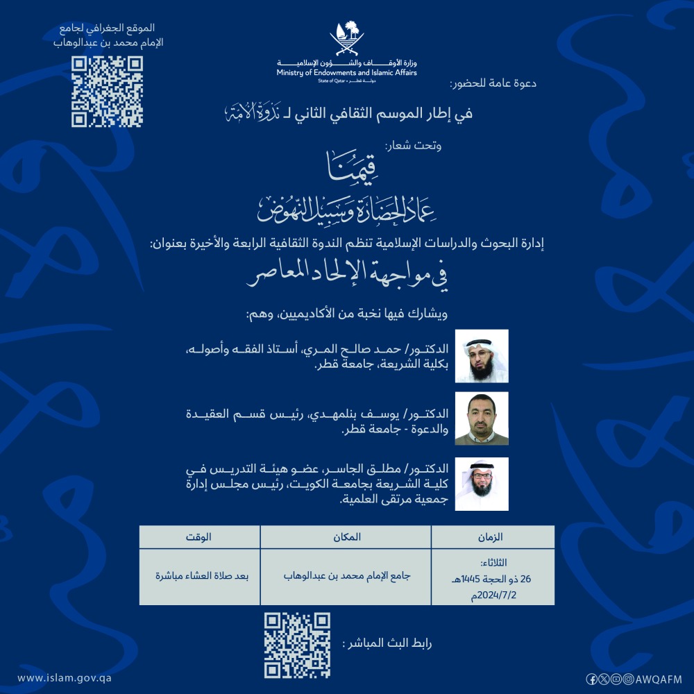 تنظم إدارة البحوث والدراسات الإسلامية في وزارة الأوقاف والشؤون الإسلامية، في ختام فعاليات موسمها الثقافي الثاني لندوة «الأمة» مساء اليوم الثلاثاء 2 يوليو 2024م، ندوتها الرابعة بعنوان: «في مواجهة الإلحاد المعاصر» لمناقشة ظاهرة «الإلحاد» في المجتمع الغربي، ومحاولات تصديرها للمجتمع المسلم، والنظر إليها كأداة من أدوات الحرب الحديثة على الإسلام، والبحث في سبل مواجهتها والوقاية منها وعلاج آثارها وإصاباتها من خلال قيمنا الإسلامية.
