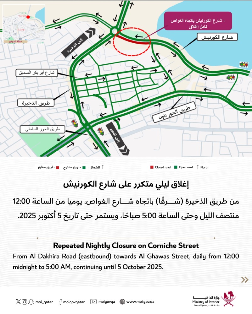 على المنعطف اليمين الحر في تقاطع الرميلة بشارع الكورنيش، للقادمين من تقاطع مسرح قطر الوطني باتجاه شارع الرميلة، يوم الجمعة 3 أكتوبر 2025، الساعة 2:00 صباحاً وحتى السبت 4 أكتوبر 2025، الساعة 12:00 صباحاً.