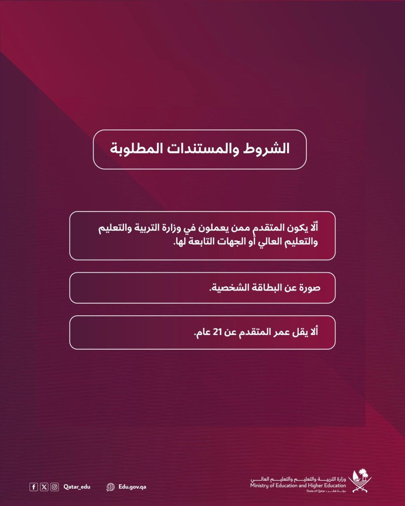 وتكون عملية استقبال الطلبات إلكترونياً على موقع وزارة التربية والتعليم عبر بوابة "فتح منشأة تعليمية جديدة" على الرابط: https://edulicenses.edu.gov.qa، بشروط ومتطلبات خاصة بالمالك والمبنى المدرسي والجانب الأكاديمي، وفقاً لدليل شروط وإجراءات منح تراخيص المدارس الخاصة.