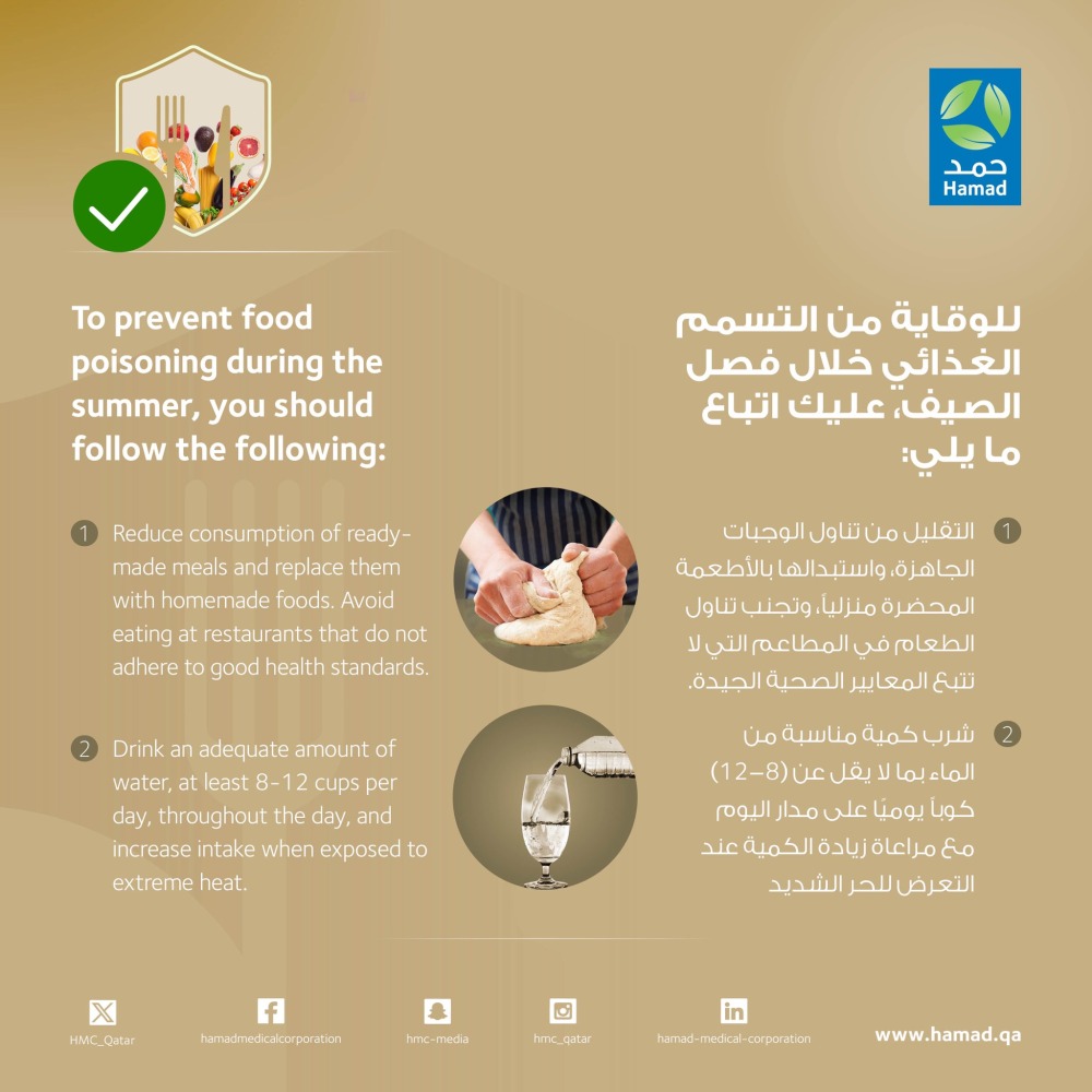 حذرت مؤسسة حمد الطبية من مخاطر الوجبات الجاهزة في فصل الصيف للوقاية من تعرضك للتسمم الغذائي، مؤكدة أهمية الحرص على تناول كميات محددة من المياه على مدار اليوم.