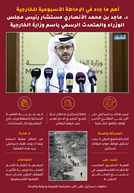 وقال الأنصاري خلال الإحاطة الإعلامية لوزارة الخارجية، إن العمليات العسكرية الإسرائيلية في مدينة غزة، التي تشهد كثافة سكانية كبيرة، أدت إلى كارثة إنسانية متفاقمة وسقوط مئات الضحايا المدنيين، موضحًا أن هذه التحركات تضع الجميع أمام تهديد حقيقي، بما في ذلك الرهائن، الذين يُفترض أن إسرائيل تسعى لتحريرهم. وبيّن الأنصاري أن الاقتراحات المتعلقة بالهدنة مرهونة بوجود إرادة سياسية حقيقية من الطرف الإسرائيلي، لافتًا إلى أن الجهود الدولية والإقليمية لا تزال مستمرة، إلا أنه «لا جديد ملموس حتى الآن يمكن الإعلان عنه».