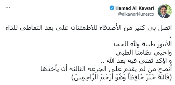 وقال الدكتور حمد الكواري – على حسابه الرسمي بموقع تويتر – "اتصل بي كثير من الأصدقاء للاطمئنان علي بعد التقاطي للداء، الأمور طيبة ولله الحمد وأحيي نظامنا الطبي وأؤكد ثقتي فيه بعد الله .. أنصح من لم يقدم على الجرعة الثالثة أن يأخذها (فَاللّهُ خَيْرٌ حَافِظاً وَهُوَ أَرْحَمُ الرَّاحِمِينَ)".