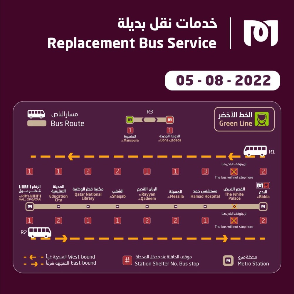 وأوضح أنه سيتم توفير خدمات نقل بديلة للجمهور على الخط الأخضر فقط، علماً بأن خدمات حافلات مترولينك ستعمل كالمعتاد، مشيراً إلى أن خدمات الحافلات البديلة ستعمل كل 10 دقائق بين: