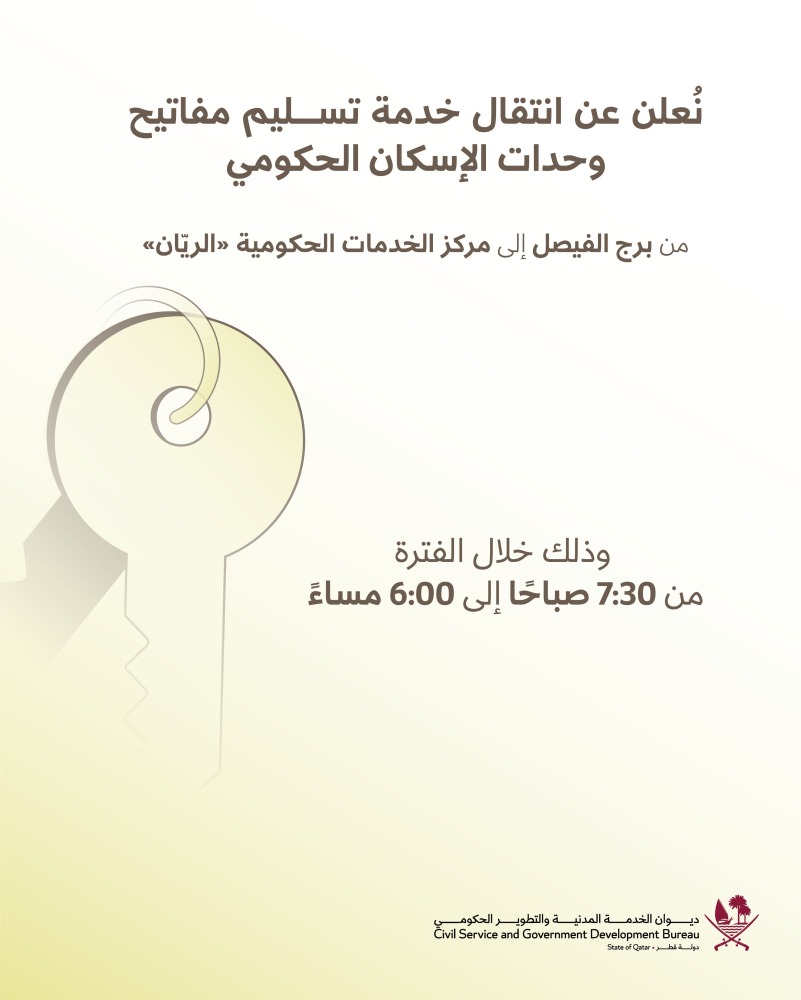 أعلن ديوان الخدمة المدنية والتطوير الحكومي عن نقل خدمة تسليم واستلام المفاتيح التابعة لشؤون الإسكان والمباني الحكومية من برج الفيصل إلى مركز خدمات الريان.