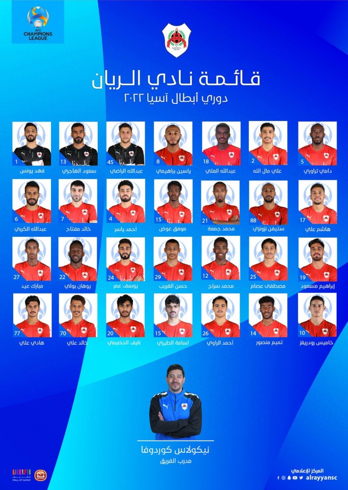 أعلن نادي الريان عن قائمة الفريق الأول لكرة القدم المشاركة في دوري أبطال آسيا، حيث يلعب ضمن المجموعة الأولى التي تضم حامل اللقب فريق الهلال السعودي والشارقة الإماراتي والاستقلال الطاجيكي.