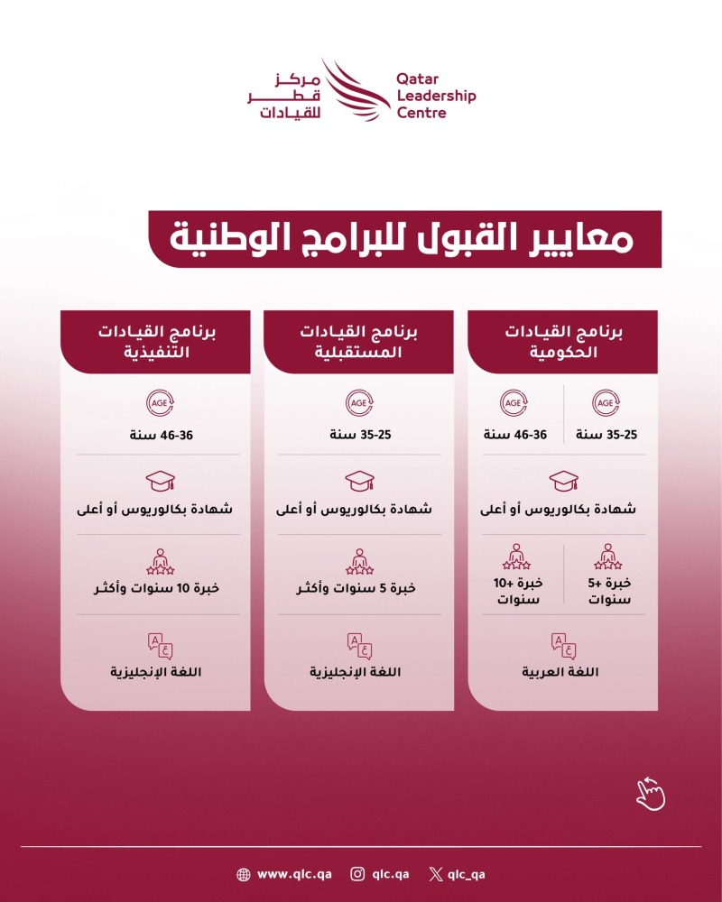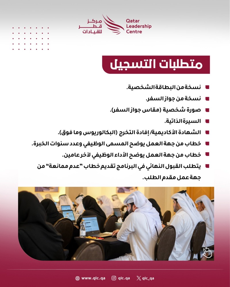 في إطار جهوده المتواصلة لبناء قيادات وطنية مؤهلة تقود مسيرة التنمية في مختلف القطاعات، أعلن مركز قطر للقيادات عن فتح باب التسجيل للالتحاق بالبرامج الوطنية للعام 2026، وذلك ابتداءً من الثلاثاء 5 أغسطس، وحتى يوم الأربعاء 20 أغسطس 2025.