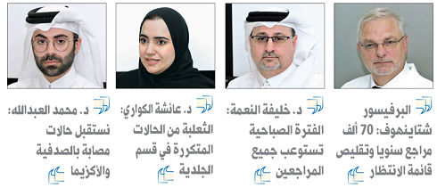 كما كشف الدكتور خليفة عبد الله النعمة- استشاري الأمراض الجلدية والمدير المشارك والمساعد لرئيس قسم الأمراض الجلدية- أن قسم الأمراض الجلدية لديهم يستقبل الحالات المحولة من مستشفى حمد العام، والحالات المحولة من القطاع الخاص، لافتا إلى أن افتتاح عيادات مسائية لقسم الأمراض الجلدية يعتمد على الاحتياج الفعلي لعيادات مسائية إلا أنه وللآن المواعيد تغطي أعداد المرضى، وأنه في حال تبين أن المواعيد بعيدة سيعاد التفكير في افتتاح عيادات مسائية.