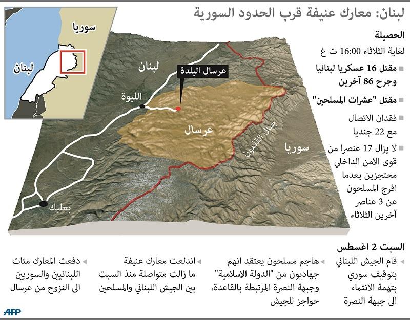 وكان تم مساء أمس الإعلان عن هدنة إنسانية لمدة 24 ساعة في عرسال لإجلاء المدنيين المصابين من البلدة والسماح لعشرات الآلاف من المواطنين المحاصرين بمغادرة المنطقة.