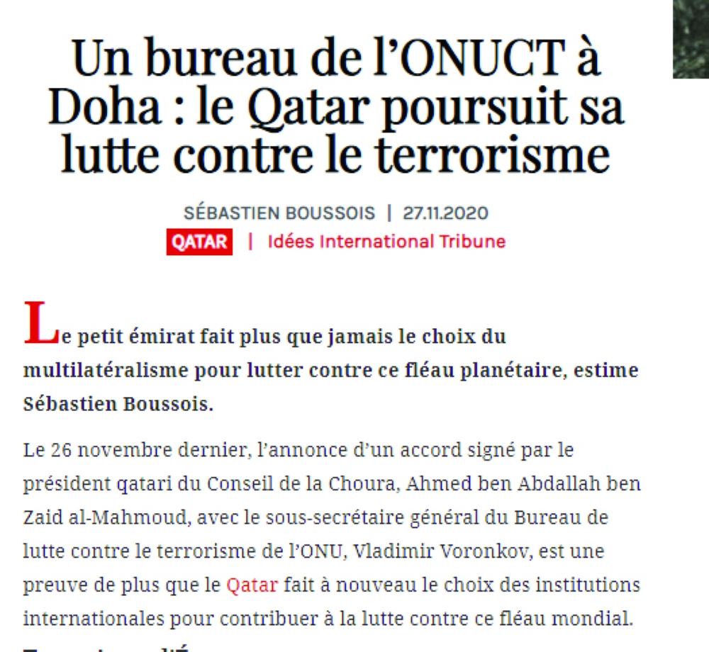 ونقل التقرير تأكيد سعادة الدكتور مطلق بن ماجد القحطاني، المبعوث الخاص لوزير الخارجية لمكافحة الإرهاب وفض المنازعات: "مع الربيع العربي، كان موقفنا واضحًا جدًا في دعم رغبات الشعوب في الديمقراطية في تونس ومصر". و أضاف: "نتمتع بالسيادة وسنتبع دائماً عملنا في إطار الأمم المتحدة"، وتابع: "دوري كمبعوث خاص لوزير الخارجية لمكافحة الإرهاب فريد من نوعه في الشرق الأوسط بأكمله، فعلى الرغم من التوترات، فقد لعبنا دائماً دورًا مهماً في العمل من أجل مكافحة الإرهاب في الداخل وفي الأمم المتحدة." ويمضي تقرير لوموند قائلا: في الواقع، تلتزم قطر بشيء أساسي في القانون الدولي: الدفاع عن مسؤولية الحماية، أي الاستعداد لاتخاذ إجراءات جماعية حازمة في الوقت المناسب، من خلال مجلس الأمن بدعم من الولايات المتحدة وأوروبا والأمم المتحدة في إطار التعاون المشترك، وهكذا استضافت الدوحة الاجتماع السنوي السابع للشبكة العالمية لنقاط الاتصال الوطنية بشأن المسؤولية عن الحماية في 24 و25 أبريل 2017.