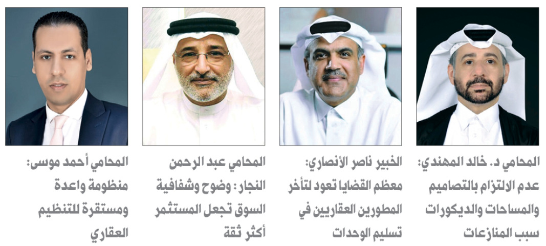 أوضح المحامي د. خالد المهندي أنّ أبرز أسباب الخلاف في منازعات التطوير العقاري عدم الالتزام بالتصاميم والمساحات والديكورات التي رافقت عقد البيع.