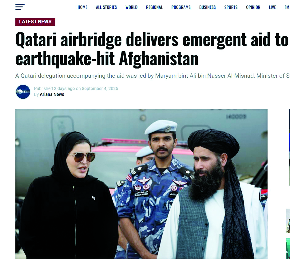 وقالت: «وصلت إلى العاصمة الأفغانية كابل تسع طائرات تابعة للقوات الجوية الأميرية القطرية، محمّلة بمساعدات إنسانية متكاملة مقدمة من صندوق قطر للتنمية، وذلك ضمن جسر جوي أطلقته دولة قطر استجابةً للزلزال المدمر الذي ضرب شرق البلاد. وشملت هذه المساعدات مستشفيين ميدانيين مجهزين بالكامل، ومواد غذائية، وأدوية، وخيامًا لإيواء الأسر المتضررة، إلى جانب سلال نظافة أساسية، حيث قدّر عدد المستفيدين بأكثر من 11,000 شخص». وشاركت في جهود الإغاثة مجموعة البحث والإنقاذ القطرية الدولية التابعة لقوة الأمن الداخلي «لخويا»، والتي أرسلت فرقًا متخصصة مزودة بمعداتها وآلياتها للعمل في المناطق المتضررة، بالإضافة إلى فريق طبي ميداني لتقديم الدعم الصحي العاجل على الأرض. وبيَّن التقرير أن مسؤولين قطريين أكدوا أن هذه المبادرة تعكس التزام دولة قطر الإنساني المستمر تجاه الشعب الأفغاني، واستعدادها الدائم للاستجابة للكوارث الطبيعية في المنطقة.