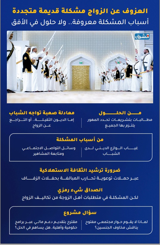 ولفت المواطنون والمختصون إلى ان ظاهرة العزوف صارت متنامية حتى أنه باتت تثير القلق لما لها من انعكاسات على التركيبة الاجتماعية ومستقبل الأسر..وقالوا إن التحديات الجديدة التي يواجهها الجيل الحالي جعلت الطريق إلى الزواج مليئا بالعقبات.