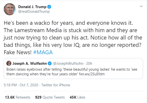 وكتب ترامب، تغريدة على حسابه الرسمي في تويتر ناعتًا بها خصمه بايدن: " إنّه معتوه منذ سنوات، والجميع يعرف ذلك" وأردف أنّ "وسائل الإعلام تجد نفسها مضطرّة للتعامل معه وتحاول حمايته" وأضاف "هل لاحظتم أنّ كلّ الأمور السلبيّة ومعدّل ذكائه الضعيف جدًّا لم تعد تُذكر؟ أخبارُ مضلِّلَة!".
