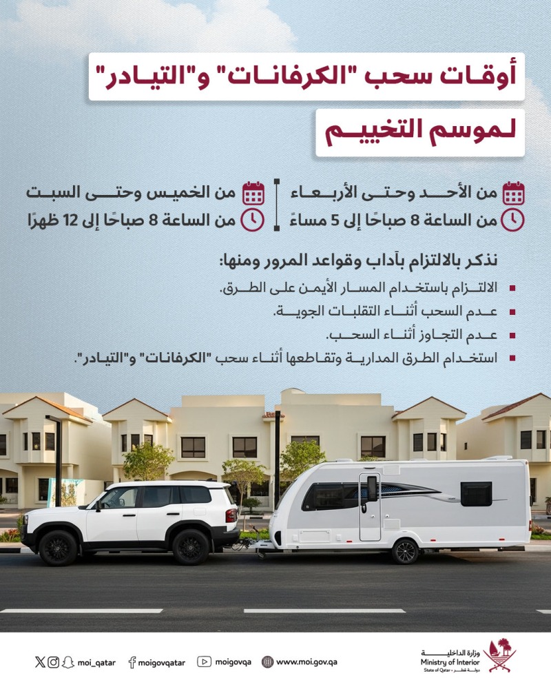 حددت وزارة الداخلية أوقات سحب الكرفانات والتيادر لموسم التخييم، منذكّر بأهمية اتباع إرشادات الأمان اللازمة.