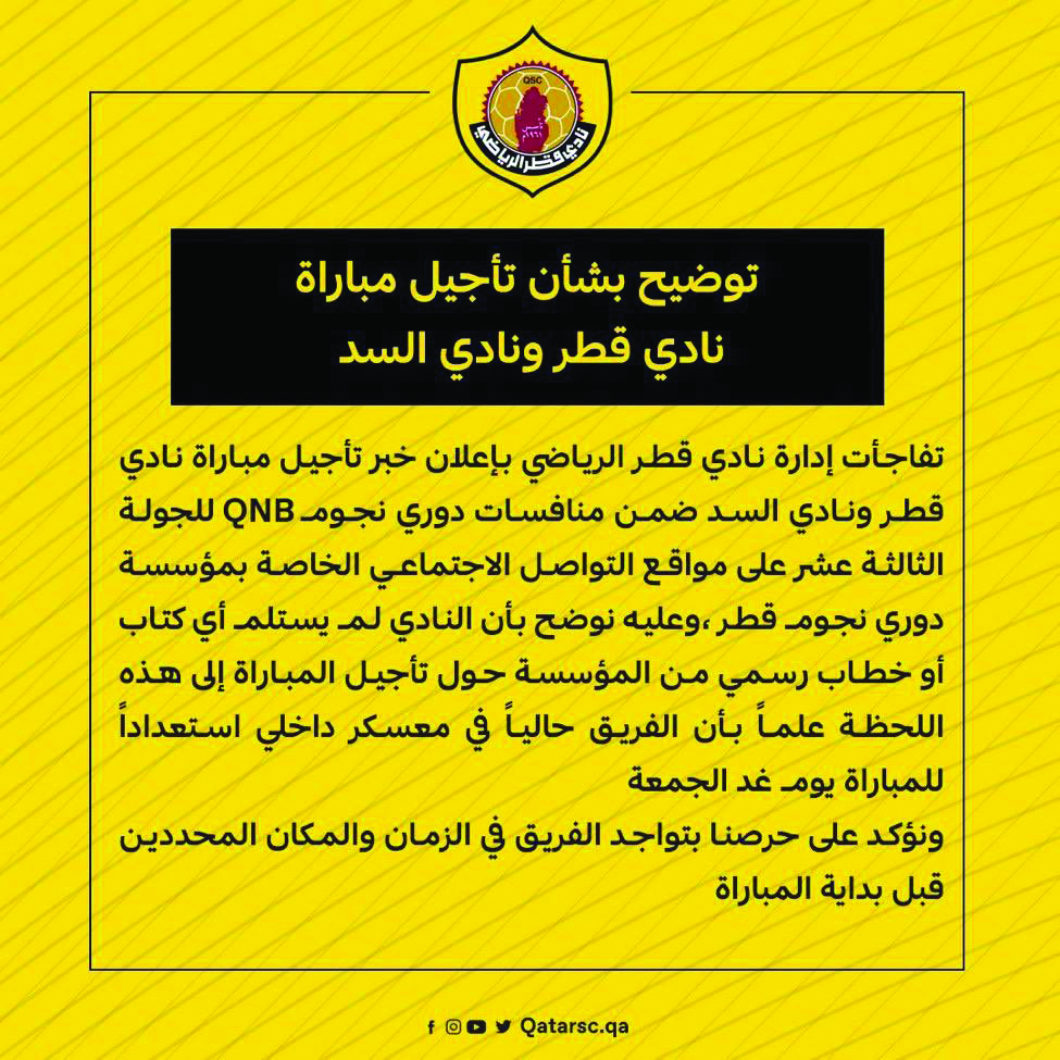 فوجئت الجماهير القطرية في وقت متأخر من مساء أمس الاول بتأجيل مباراة قطر والسد ضمن الجولة الثالثة عشرة من دوري نجوم قطر بسبب ما ذكره بيان مؤسسة دوري نجوم قطر عن ارتفاع حالات اصابة لاعبي السد بالكورونا دون ذكر اي تفاصيل عن عدد المصابين او اسمائهم وهذا ما سبب حالة من الاستهجان وعلامات الاستفهام في ظل عدم الشفافية التي تعاملت معها qsl بخصوص اسماء اللاعبين وعددهم. وما زاد من هذا اللغط والتعجب هو بيان نادي قطر الذي اكد ان الفريق ليس لديه اي علم بهذا التأجيل ولم تتم مخاطبته بهذا الخصوص وان الفريق متواجد في معسكره استعدادا لهذا اللقاء وسيكون متواجدا في الزمان والمكان لمواجهة السد. بالأمس قطر لم يذهب للمباراة والسد تحقق له ما أراد ولكن ما حدث اشبه بالفوضى وعدم التنسيق بين الجهة المسؤولة عن تنظيم الدوري وفرقنا الكروية وهذا ما جعل الفريق المنافس اخر من يعلم.