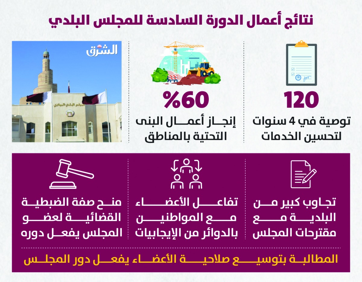 وقالوا لـ الشرق إن الدورة السادسة تعتبر ناجحة، إذ إنها قد شهدت الكثير من التوصيات الإيجابية التي قام بها المجلس فيما يتعلق بخدمة المواطنين، وقد عُمل بالعديد منها من قبل الجهات الحكومية، ويأتي على رأسها المرافق والخدمات في مختلف الدوائر، إذ تعد غالبية الدوائر خدماتها مكتملة.وأشار أعضاء بالبلدي إلى أن المجلس على مدار 4 سنوات، ناقش قضايا عديدة وكان لها ردود افعال إيجابية، ولكن كان هناك بعض التحديات التي واجهتم وابرزها جائحة كورونا التي عطلت الأعمال، لفترة تصل عامين اى نصف الدورة تقريبا... وأكدوا أن الكثير من الدوائر قد شهدت انجاز العديد من الخدمات، بالإضافة إلى اكتمال البنية التحتية لكل منطقة، والتي قد تخطت نسبة الـ 60 % اكتمال الأعمال بها.