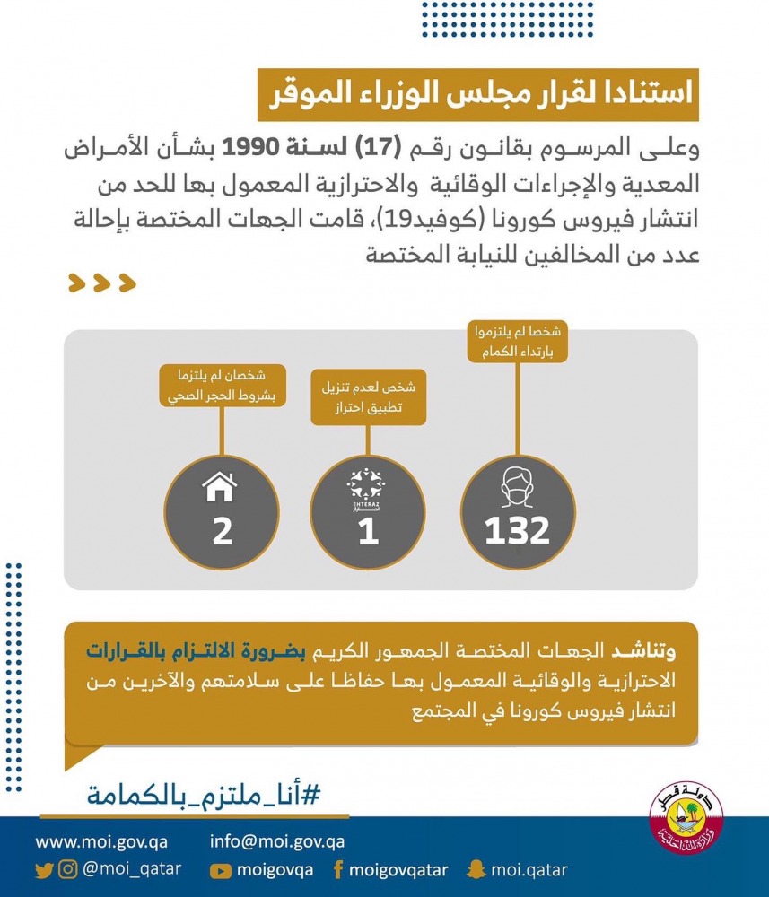 أحالت الجهات المختصة 135 شخصًا للنيابة المختصة لعدم تقيدهم بالإجراءات الوقائية والاحترازية المعمول بها في الدولة للحد من انتشار فيروس كورونا "كوفيد -19".