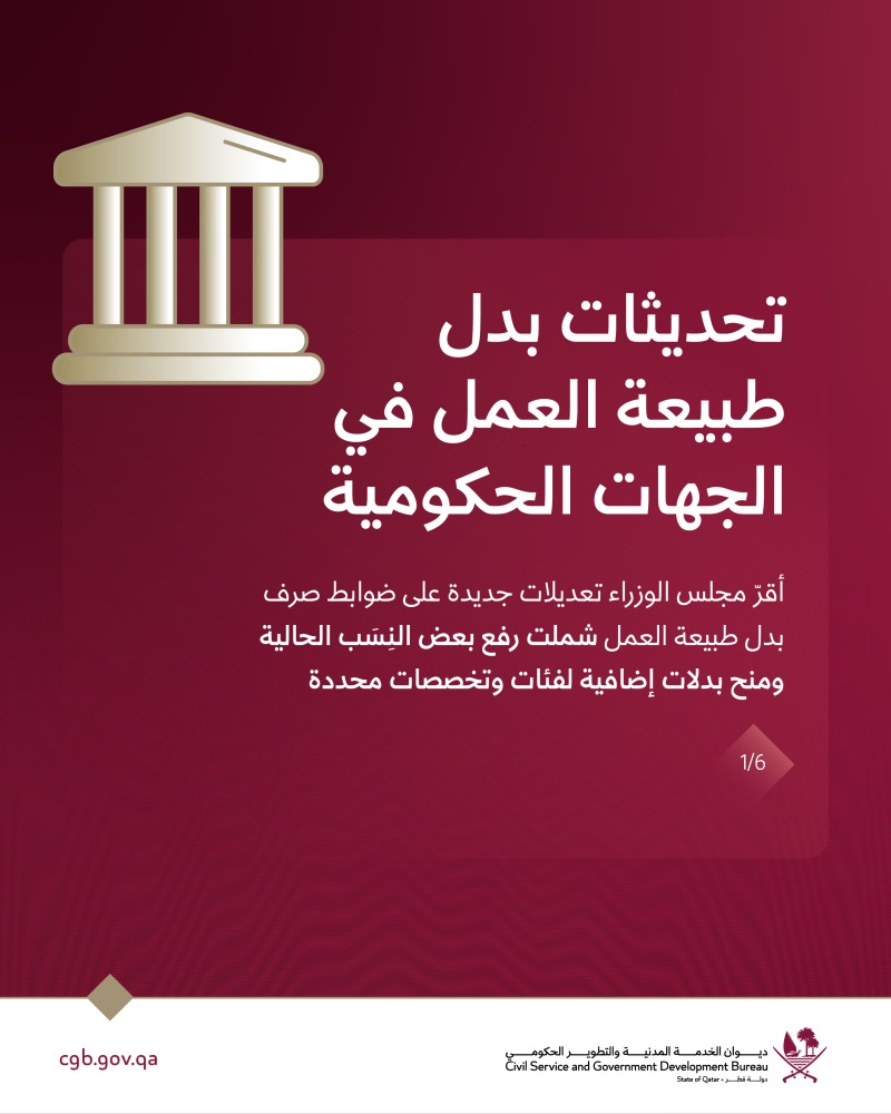 أقر مجلس الوزراء تعديلات جديدة على ضوابط صرف بدل طبيعة العمل في الجهات الحكومية، حيث شملت التحديثات رفع بعض النسب الحالية ومنح بدلات إضافية لفئات وتخصصات محددة.