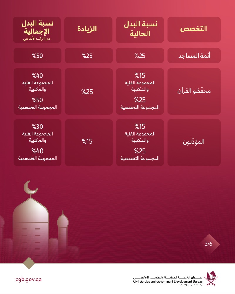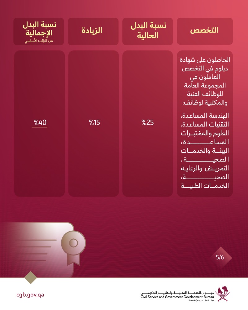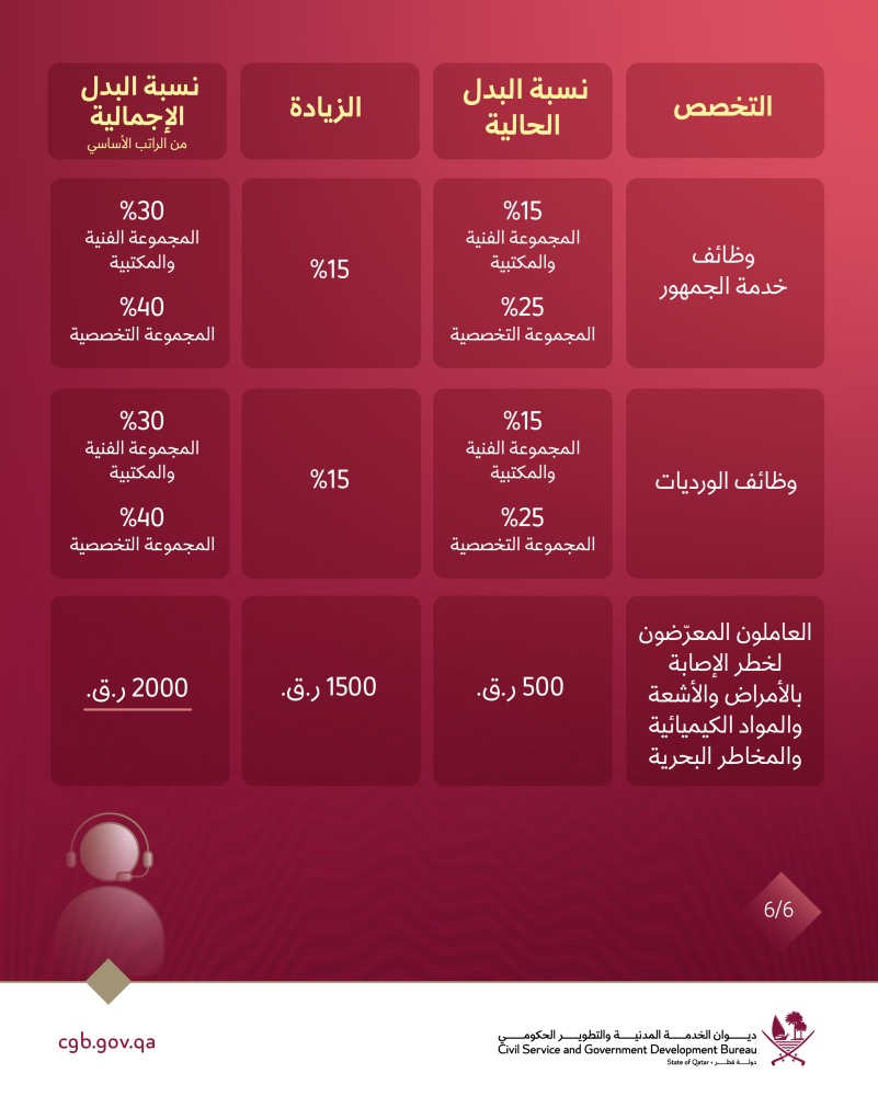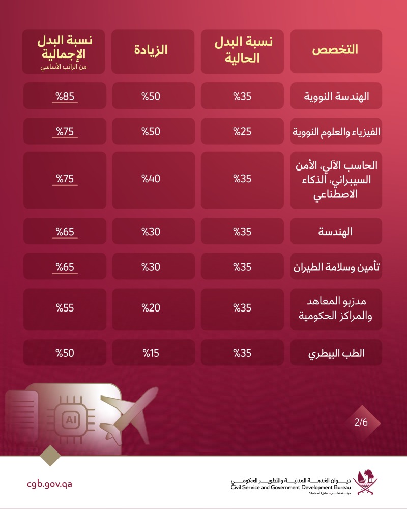 ووأوضح ديوان الخدمة المدنية والتطوير الحكومي أن التعديلات زيادة في نسب البدل الإجمالية لتخصصات متنوعة مثل الهندسة النووية، والفيزياء، والحاسب الآلي، والهندسة، والطب البيطري. كما تم رفع بدلات الوظائف الدينية كأئمة المساجد ومحفّظي القرآن والمؤذنين.