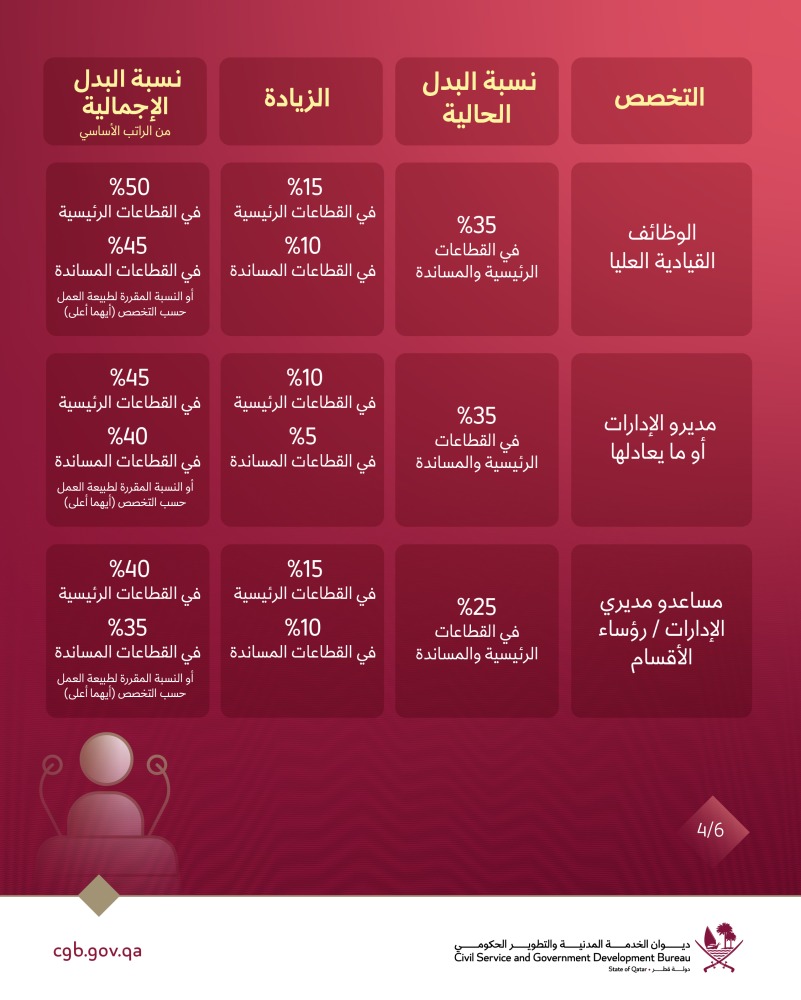 وتضمنت التحديثات أيضاً زيادة في بدلات الوظائف القيادية العليا، ومديري الإدارات، ومساعديهم، بالإضافة إلى رفع بدل طبيعة العمل للحاصلين على شهادة دبلوم في تخصصات فنية ومكتبية محددة. كما تم زيادة بدلات وظائف خدمة الجمهور والورديات، ورفع قيمة البدل للعاملين المعرضين للمخاطر.