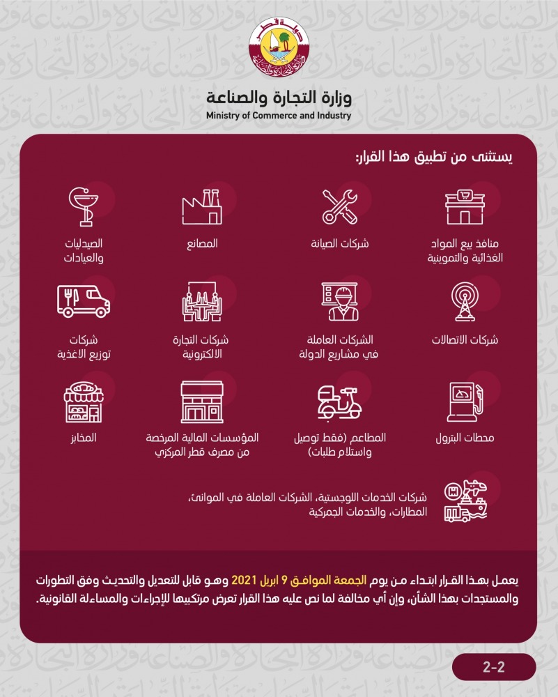 وأوضحت وزارة التجارة والصناعة أنه يُعمل بهذا القرار من يوم الجمعة الموافق 9 أبريل وهو قابل للتعديل والتحديث وفق التطورات والمستجدات بهذا الشأن وأن أي مخالفة لما نص عليه هذا القرار تعرض مرتكبيها للإجراءات والمساءلة القانونية.