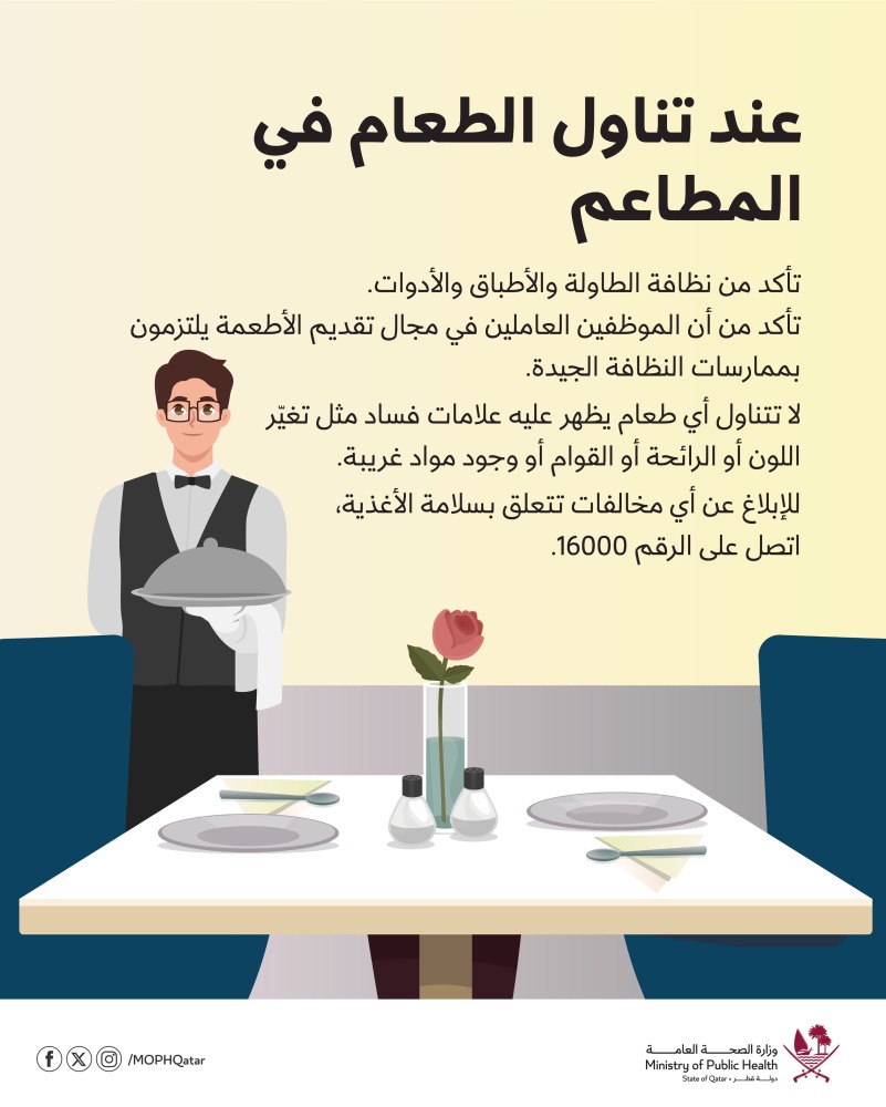 - للإبلاغ عن أي مخالفات تتعلق بسلامة الأغذية اتصل على الرقم 16000.