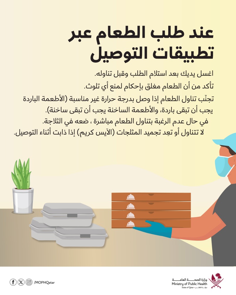وضمن سلسلة منشورات توعوية نشرتها وزارة الصحة عبر حسابها بمنصة "إكس"، اليوم الأحد، نبهت إلى 5 أشياء هامة يجب الانتباه لها عند عند طلب الطعام عبر تطبيقات التوصيل: