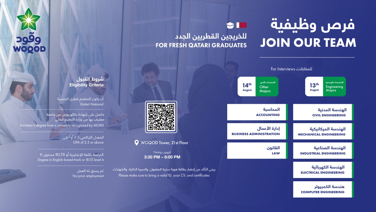 أعلنت شركة قطر للوقود (وقود) عن وظائف شاغرة للخريجين القطريين الجدد في 8 تخصصات محددة موعد المقابلات يومي الأربعاء والخميس المقبلين الموافقين 13 و14 أغسطس الجاري من الساعة 3 مساءً إلى 6 مساءً، مع أهمية إحضار بطاقة هوية سارية المفعول والسيرة الذاتية والشهادات.