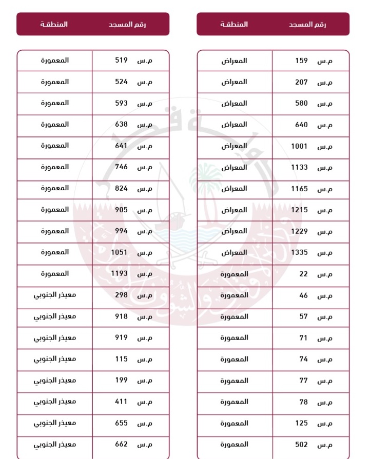 أعلنت وزارة الأوقاف والشؤون الإسلامية عن قوائم المساجد "500 مسجدا" التي سيتم إعادة فتحها في المرحلة الأولى من مراحل الرفع التدريجي للتدابير الاحترازية وقيود كورونا في مختلف مناطق الدولة ، مع الأخذ بعين الاعتبار كل الإجراءات الاحترازية في المساجد التي تتناسب مع الإجراءات الصحية الحالية من حيث موقعها ومساحتها والكثافة السكانية المحيطة بها.