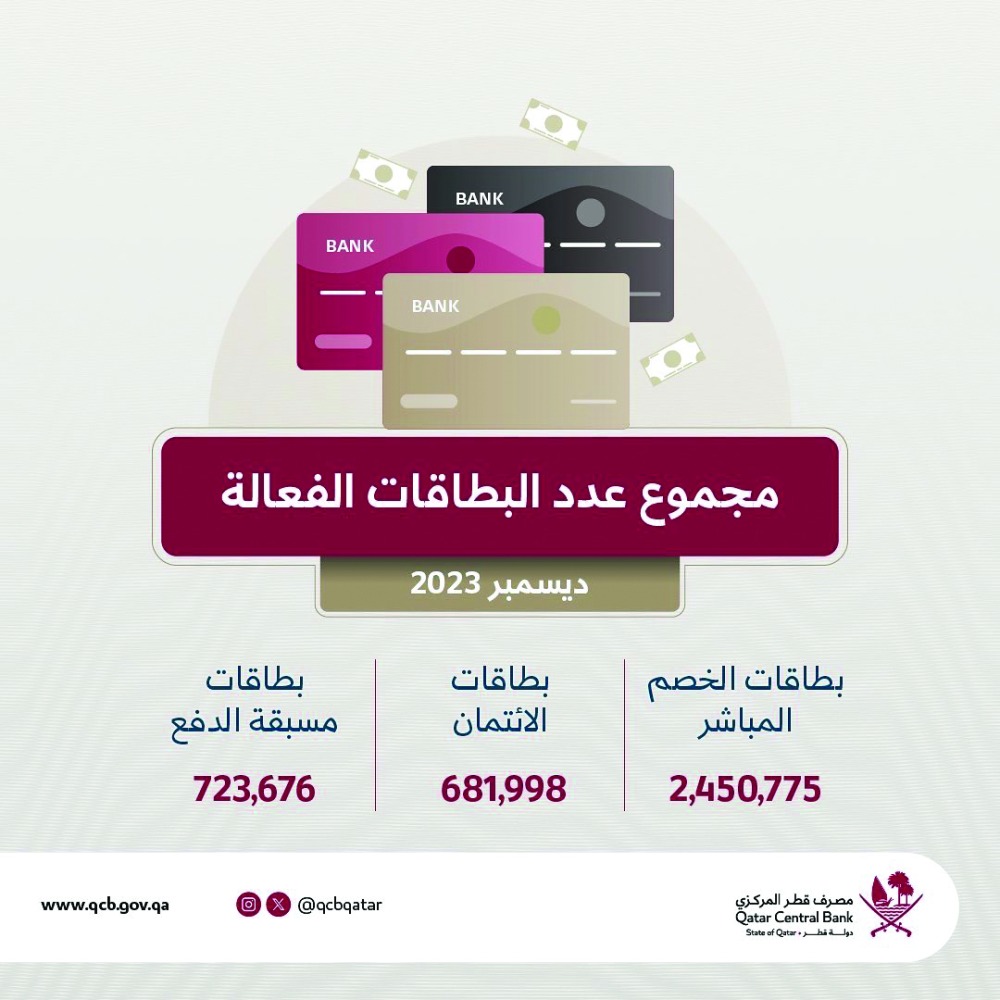 وبين المركزي أن عدد البطاقات الفعالة بلغ في شهر ديسمبر الماضي من بطاقات الخصم المباشر 2.45 مليون بطاقة، و681.99 ألف بطاقة ائتمان، و723.67 ألف بطاقة مسبقة الدفع.