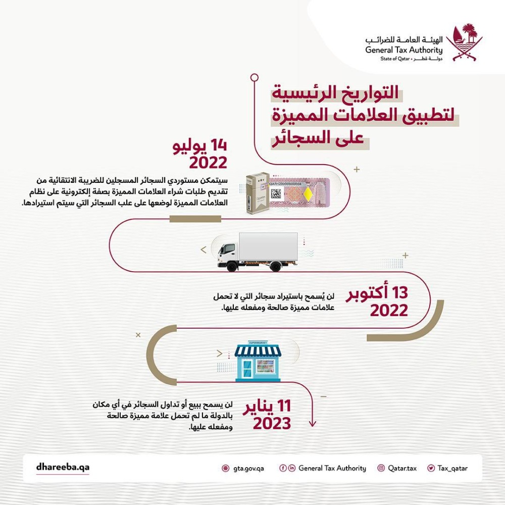 كما أنه اعتباراً من 11 يناير 2023 ، لن يسمح ببيع أو تداول السجائر في أي مكان بالدولة ما لم تحمل علامة مميزة صالحة ومفعلة عليها .