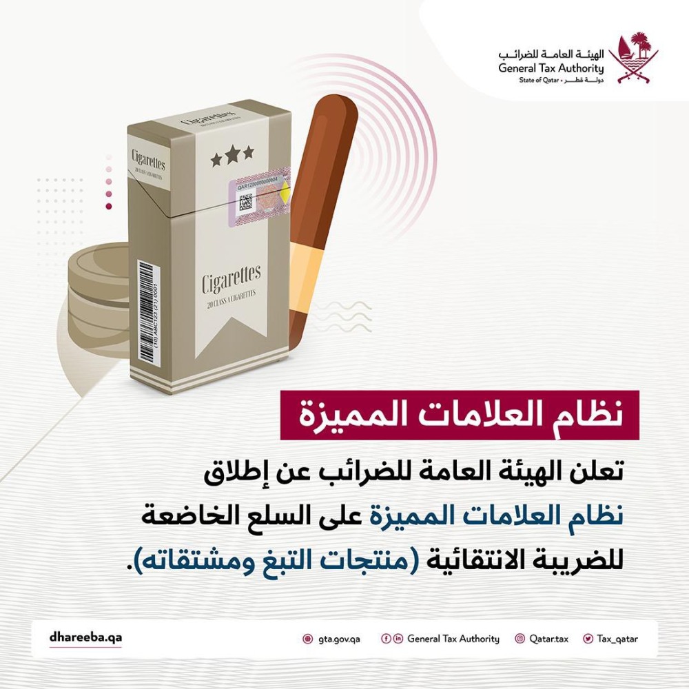 أعلنت الهيئة العامة للضرائب عن إطلاق نظام العلامات المميزة على السلع الخاضعة للضريبة الانتقائية ( منتجات التبغ ومشتقاته) .