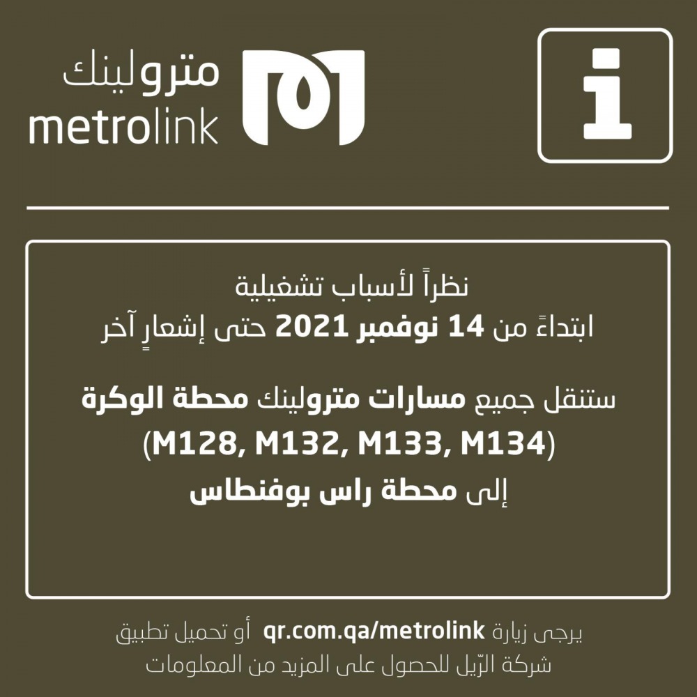 أعلن مترو الدوحة أن جميع مسارات مترولينك محطة الوكرة (M134 ,M133 ,M132 ,M128) ستنقل إلى محطة راس بوفنطاس، وذلك ابتداء من 14 نوفمبر 2021 حتى إشعار آخر.