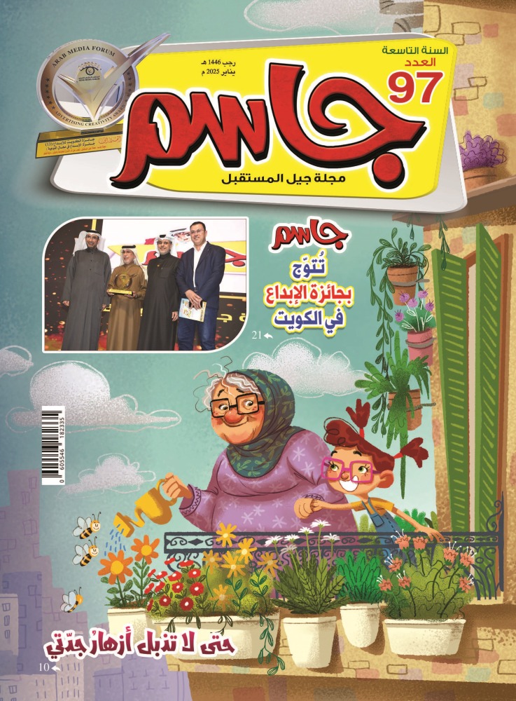 العدد الجديد به ملف خاص عن فوز مجلة جاسم بجائزة الإبداع التي حصلت عليها من دولة الكويت الشقيقة، كما يتضمن مجموعة من القصص التربوية المصورة مثل قصة «يمان وآيات القرآن» التي تدور حول قوله تعالى في سورة البلد «وَتَوَاصَوْا بِالْمَرْحَمَةِ»، وقصة الغلاف «حتى لا تذبل أزهار جدتي» وهي قصة سردية تلقي الضوء على أهمية وجود كبار القدر في حياتنا، كما أن هناك مغامرة كاملة من 7 صفحات مصورة بعنوان «الأعشاب النادرة» وقصة تربوية أخرى بعنوان «شمس الحرية».