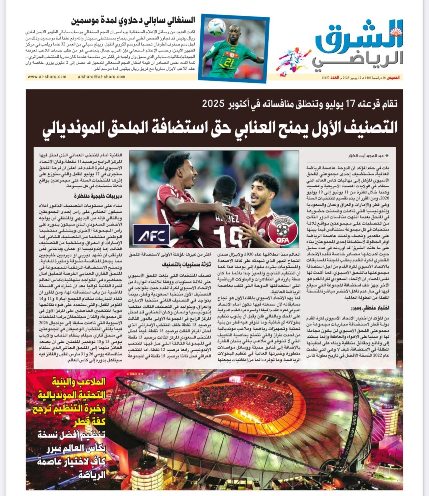 وكانت "الشرق" قد انفردت باستضافة الدوحة، عاصمة الرياضة العالمية، إحدى مجموعتي الملحق الآسيوي المؤهل إلى نهائيات كاس العالم التي ستقام في الولايات المتحدة الأمريكية والمكسيك وكندا خلال الفترة من 11 يونيو إلى 19 يوليو 2026، ومن المقرر أن يتم تقسيم المنتخبات الستة وهي قطر والإمارات والعراق وعمان والسعودية وإندونيسيا التي تأهلت وضمنت حضورها في الملحق بعدما انتهت منافسات الدور الثالث من التصفيات على مجموعتين بواقع ثلاثة منتخبات في كل مجموعة ستتنافس فيما بينها على مقعدين ونصف.