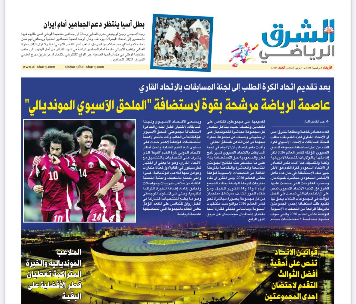 وانفردت "الشرق" أيضاً بخبر تقدم الاتحاد القطري لكرة القدم بطلب للجنة المسابقات بالاتحاد الآسيوي لكرة القدم من اجل استضافة مجموعة الملحق الآسيوي المؤهِّلة لكأس العالم 2026 المقر إقامتها بالولايات المتحدة الامريكية وكندا والمكسيك