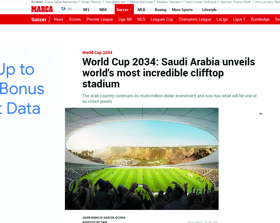 وشددت الصحيفة على أن المملكة العربية السعودية التي ازداد صيتها الرياضي وأضحت قوة عظمى في الرياضة العالمية حصلت على تنظيم نهائيات كأس العالم 2034، بنظام التناوب بين قارات العالم الست، وكانت المرشح الوحيد من قارتي آسيا وأوقيانوسيا بعد انسحاب دولتي أستراليا وإندونيسيا من المنافسة على تنظيم البطولة وتراجع الصين التي ارتأت تأجيل طموحها في تنظيم الحدث العالمي إلى موعد لاحق..