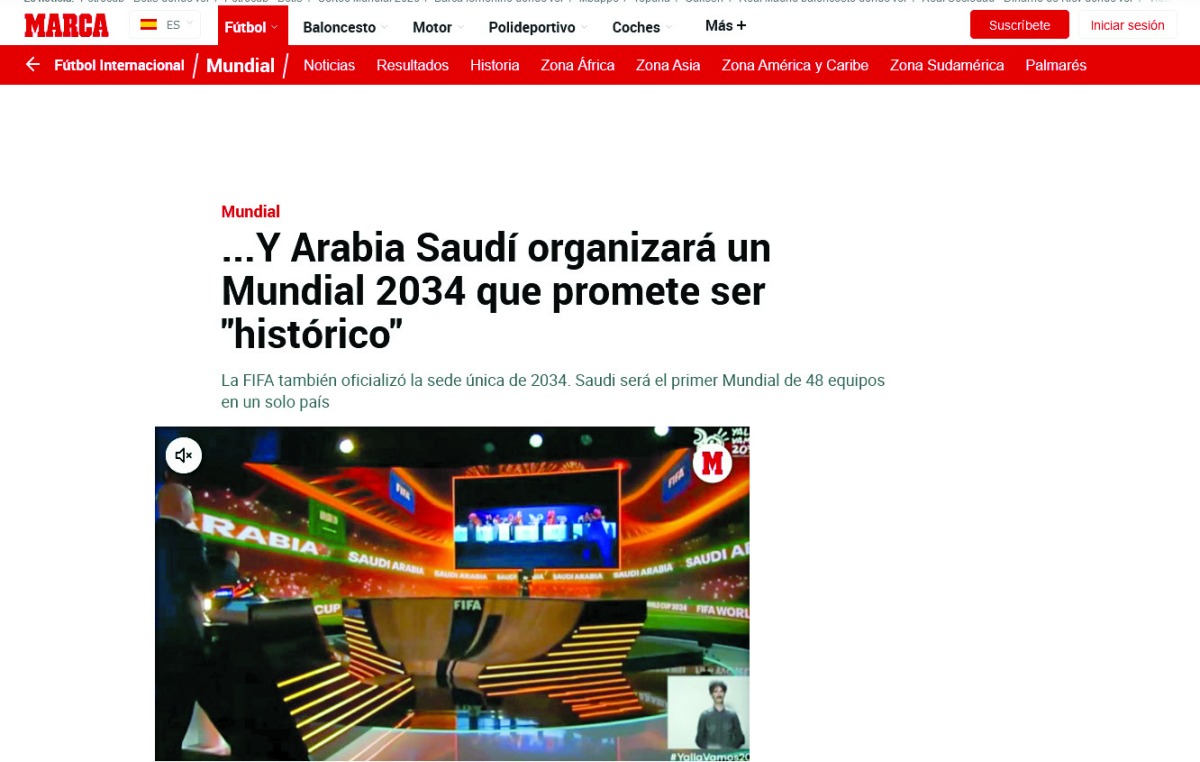 وكتبت صحيفة "ماركا " الرياضية الفرنسية: تم الإعلان رسميا عن استضافة المملكة العربية السعودية، كأس العالم 2034".