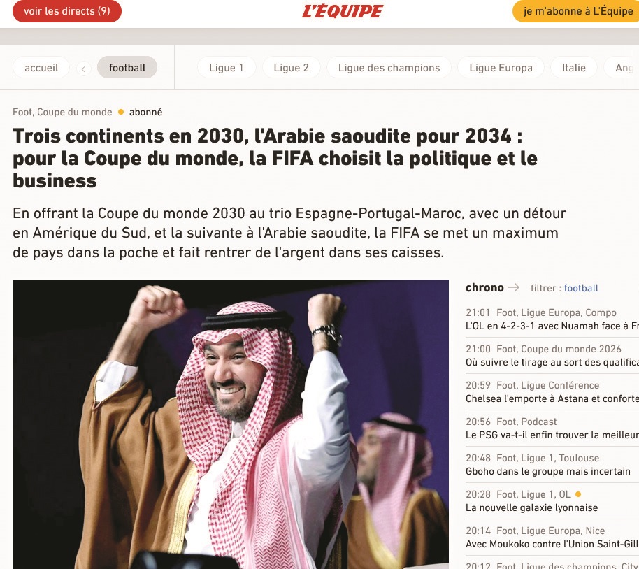 وكتبت صحيفة" ليكيب " الرياضية الفرنسية أن الاتحاد الدولي لكرة القدم منح المملكة العربية السعودية شرف تنظيم نهائيات كأس العالم 2034 بعد اجتماع عقده عبر تقنية الاتصال المرئي مع أعضائه البالغ عددهم 221 اتحادا، منوهة إلى أنها كانت المرشح الوحيد لاستضافة البطولة.