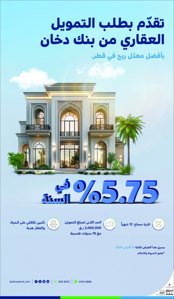 وفي أحدث عروضه في هذا الجانب، كشف بنك دخان عن حملته الترويجية للتمويل العقاري والتي تقدّم أفضل معدّل ربح في قطر بنسبة 5.75% في العام عند الحصول على تمويل عقاري بحد أدنى 2,000,000 ريال قطري للتقسيط على 10 سنوات، وذلك ضمن التزامه بتمكين العملاء من التخطيط لمستقبلهم وتحقيق أقصى استفادة من حاضرهم،
