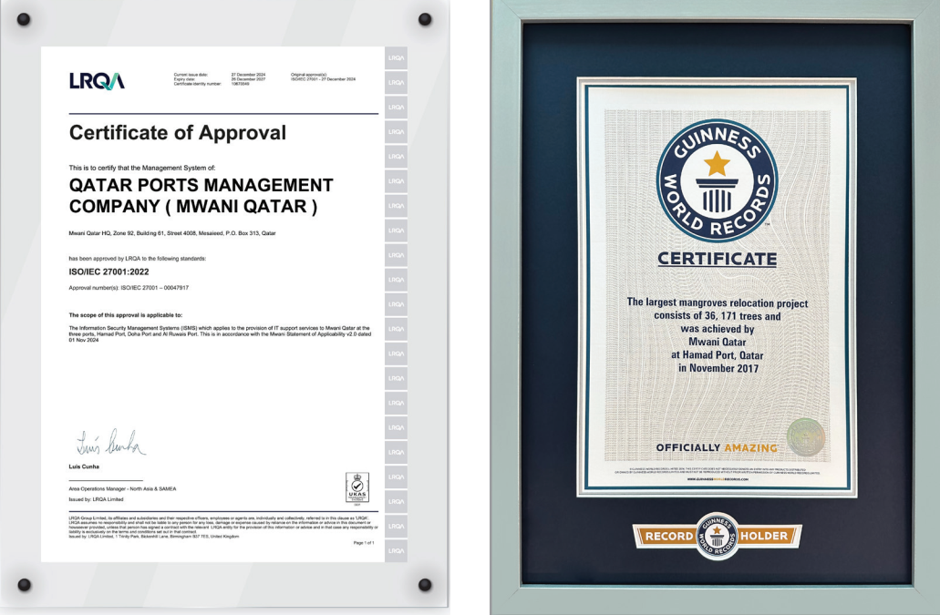 كما واصلت مواني قطر الأداء المتميز في مختلف المجالات التشغيلية والبيئية والرقمية والمجتمعية، مع التركيز على تطوير البنية التحتية للموانئ وتطبيق أعلى معايير الكفاءة والاستدامة والابتكار. ويأتي حصول الشركة على شهادة الجودة ISO27001 في نظم إدارة أمن المعلومات كدليل واضح على التزامها بتطبيق أحدث المعايير الدولية وحماية البيانات الحيوية باستخدام أحدث التقنيات.