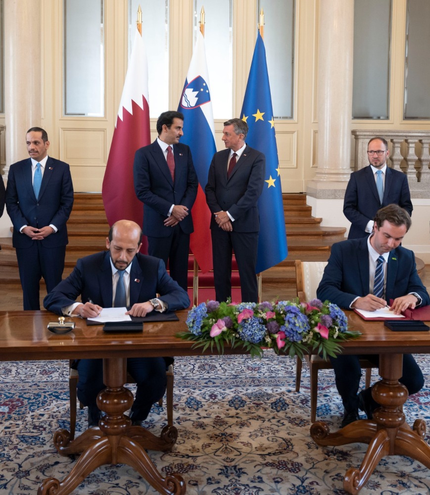 عقب ذلك شهد حضرة صاحب السمو أمير البلاد المفدى، وفخامة رئيس جمهورية سلوفينيا، التوقيع على مذكرة تفاهم بين قطر القابضة ووكالة سبيريت لتشجيع ريادة الأعمال والاستثمارات الأجنبية والتكنولوجيا في سلوفينيا.
