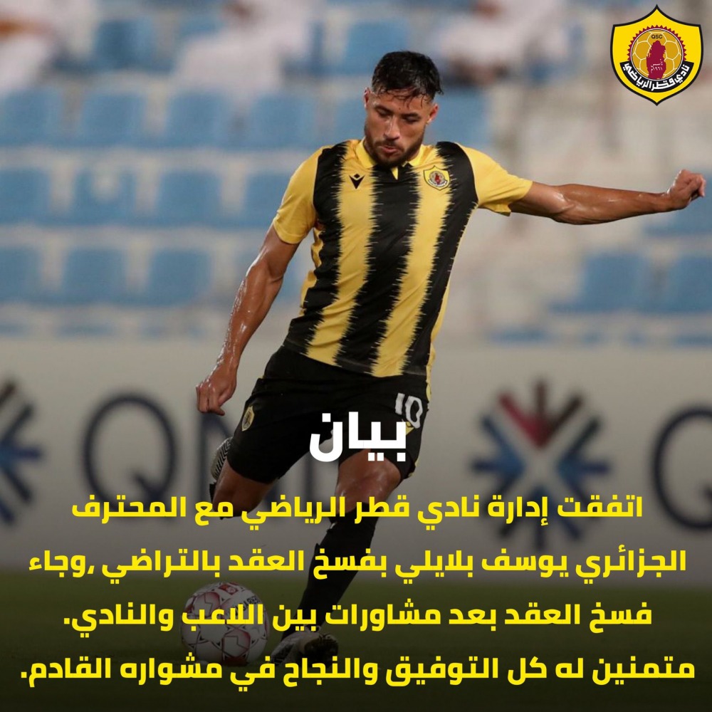 أعلن نادي قطر الرياضي أن إدارة النادي اتفقت مع المحترف الجزائري يوسف بلايلي بفسخ العقد بالتراضي.