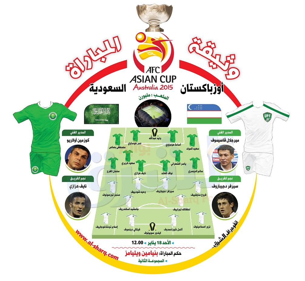 كل شيء أو لا شيء.. هكذا سيكون شعار كل من منتخبي السعودية وأوزبكستان عندما يلتقيان غدا الأحد، على الاستاد المستطيل في ملبورن بالجولة الثالثة من مباريات المجموعة الثانية في الدور الأول لبطولة كأس آسيا 2015 بأستراليا.