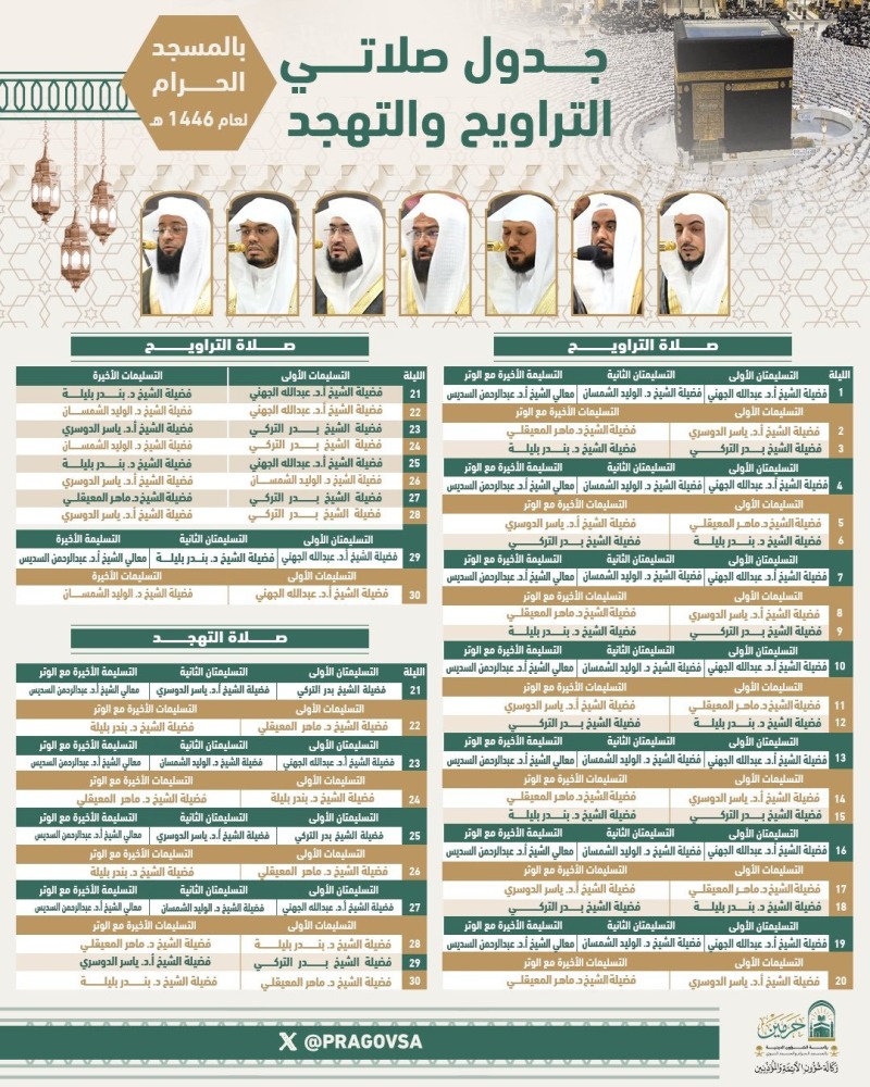 وتضمن جدول صلاتي التراويح والتهجد بالمسجد الحرام لعام 1446هـ، بحسب وكالة الأنباء السعودية، كلًا من الشيخ الدكتور عبدالرحمن السديس، والشيخ الدكتور ماهر المعيقلي، والشيخ الدكتور عبدالله الجهني، والشيخ الدكتور بندر بليلة، والشيخ الدكتور ياسر الدوسري، والشيخ بدر التركي، والشيخ الدكتور الوليد الشمسان.