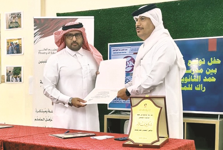 وقع مصنع راك للمنظفات مذكرة تفاهم مع مدرسة جاسم بن حمد الثانوية للبنين لتدريب الطلاب في مختلف مجالات البحث العلمي. وأوضح السيد صالح العذبة مدير المصنع في تصريح خاص لـ "الشرق" أن توقيع هذه المذكرة جاء في إطار المسؤولية المجتمعية للمصنع والشراكة مع قطاع التعليم ممثلا بمدرسة جاسم بن حمد الثانوية للبنين التي تعتبر من المدارس الرائدة في الدولة، وفي إطار الحرص المشترك على تنمية مهارات الطلاب وتدريبهم في مجال البحث العلمي.