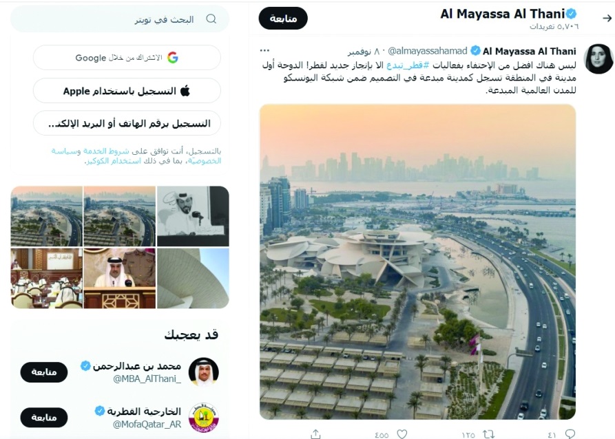 **دولة قطر استعدت كامل الاستعداد لمستقبلها، فقد بنت لنفسها رؤية متجددة، فما توصلت إليه الدولة اليوم هو بفضل الجهود القائمة على خطط استراتيجية مدروسة وحلول وضعتها قطر لنفسها لتصبح دولة عظيمة. فقد اهتمت حكومتنا الرشيدة بأمور ساعدت على دعم سياسات اليونسكو وهي التخطيط والرؤية وإدارة المشاريع بحرفية، وتنمية الإبداع، وبذلك تأتي الإستدامة.